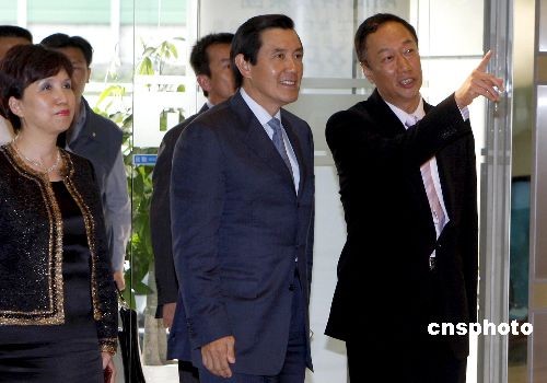 4月7日,馬英九拜訪鴻海集團董事長郭臺銘(右),請教有關(guān)臺灣振興經(jīng)濟的走向。郭臺銘親自接待,并以對聯(lián)闡述看法。中新社發(fā) 杜洋 攝