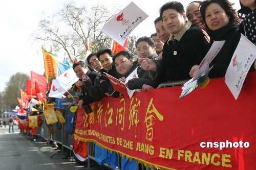 法國當(dāng)?shù)貢r(shí)間4月7日中午,北京奧運(yùn)圣火在“浪漫之都”巴黎傳遞在巴黎的地標(biāo)埃菲爾鐵塔拉開帷幕。圖為法國巴黎當(dāng)?shù)厝A人華僑在埃菲爾鐵塔下迎接奧運(yùn)圣火。 沈晨 攝