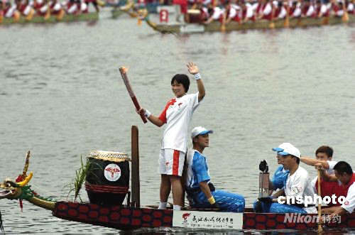 五月二日,全球首次龍舟傳送奧運火炬在香港舉行,泳隊運動員施幸余乘龍舟,手持火炬橫渡城門河。中新社發(fā) 譚達明 攝