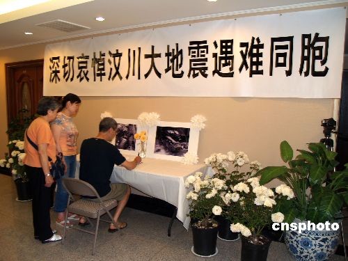 5月19日,中國駐洛杉磯總領事館開設“中國汶川地震遇難同胞悼念堂”,眾多華人華僑前來向遇難同胞鞠躬默哀,表示深切哀悼,并在悼念本上留下自己感言。