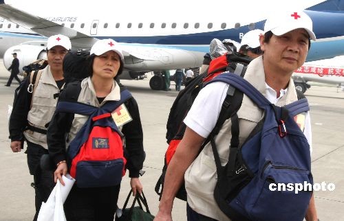 5月20日下午,以陳文長(zhǎng)為領(lǐng)隊(duì)的臺(tái)灣紅十字醫(yī)療隊(duì)一行37人以“兩岸直航”的形式乘坐臺(tái)灣華信航空的專機(jī)抵達(dá)成都機(jī)場(chǎng),之后即刻前往汶川大地震的重災(zāi)區(qū)德陽(yáng)市開(kāi)展醫(yī)療救治。中新社發(fā) 任晨鳴 攝