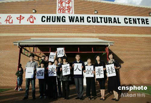 當地時間5月25日下午四時,西澳大利亞華人聚集在中華文化中心,舉辦“祈福零八,平安中國”活動為四川地震募集善款。其中,來自河南同鄉(xiāng)會的華僑打出了“四川——西澳華人的牽掛”的標語。中新社發(fā) 高周丹 攝