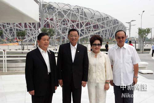 6月12日下午,海峽交流基金會董事長江丙坤參觀了北京奧運會場館,圖為江丙坤等人在“鳥巢”前留影。中新社記者 張宇 攝
