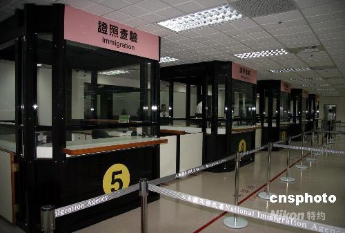 兩岸周末包機(jī)將于七月四日啟程,臺北松山機(jī)場當(dāng)日到港四班。為因應(yīng)周末包機(jī)需要,松山機(jī)場在二十多天時(shí)間內(nèi),基本完成了機(jī)場整修。圖為裝修一新的證照查驗(yàn)通道。中新社發(fā) 徐長安 攝