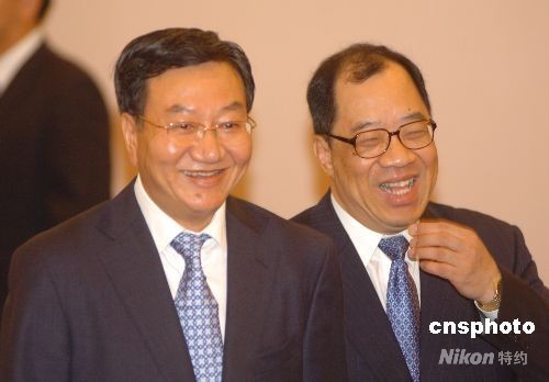 《內(nèi)地與澳門關(guān)于建立更緊密經(jīng)貿(mào)關(guān)系的安排》(CEPA)“補充協(xié)議五”三十日在澳門正式簽署,簽字代表商務(wù)部副部長姜增偉(左)與澳門特區(qū)經(jīng)濟財政司司長譚伯源笑逐顏開。中新社發(fā) 畢永光 攝
