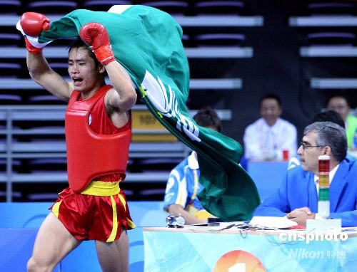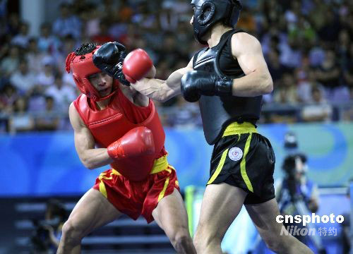 8月24日,在北京2008武術(shù)比賽男子70公斤級(jí)散手決賽中,中國澳門選手蔡良蟬(紅方)戰(zhàn)勝俄羅斯選手穆拉德·阿哈多夫,獲得冠軍。當(dāng)日,北京2008武術(shù)比賽落下帷幕。中新社發(fā) 宋吉河 攝