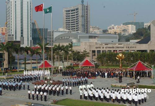 十月一日上午八時(shí),澳門各界在金蓮花廣場(chǎng)舉行隆重升國旗、區(qū)旗儀式,慶祝中華人民共和國成立五十九周年。中新社發(fā) 畢永光 攝