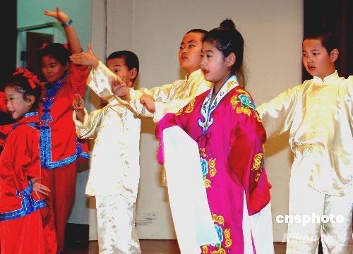 十月一日,參加“2008·陽光海峽”兩岸快樂小天使活動營的福建快樂小天使走進臺北木柵小學與在校小朋友進行交流和聯(lián)歡。圖為福建快樂小天使為臺北木柵小學師生獻上精彩的京劇表演,博得喝彩。中新社發(fā) 劉可耕 攝