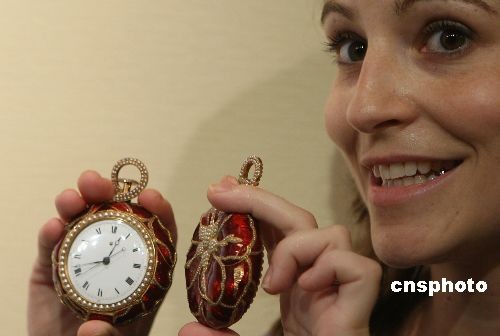 十月二十三日,佳士得在香港舉行記者會(huì),展示十二月三日名表拍賣會(huì)上的精品。圖為模特展示一款由英國(guó)皇室贈(zèng)送給中國(guó)乾隆皇帝的石榴形懷表,估價(jià)一百二十萬(wàn)至二百萬(wàn)港元。中新社發(fā) 武仲林 攝