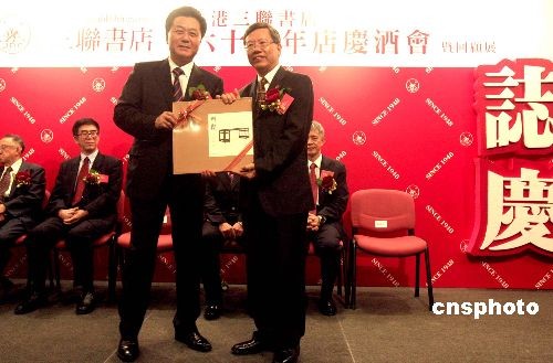 圖為三聯(lián)書店(香港)有限公司總經(jīng)理曾協(xié)泰向中聯(lián)辦副主任李剛贈(zèng)送紀(jì)念品《明韻》一書。