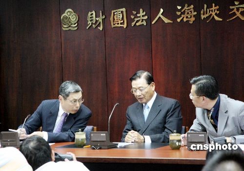 11月1日下午,;鶗(huì)在臺(tái)北舉行記者會(huì),公布海協(xié)會(huì)會(huì)長(zhǎng)陳云林5天訪臺(tái)行程,并披露兩會(huì)參加協(xié)商代表團(tuán)名單。經(jīng)海協(xié)會(huì)先遣人員與;鶗(huì)方面的最后確認(rèn),陳云林率74人的海協(xié)會(huì)代表團(tuán)將于11月3日從北京乘包機(jī)飛抵桃園機(jī)場(chǎng),而廣受矚目的今年兩會(huì)第二次“陳江會(huì)”將于11月4日舉行,并簽署協(xié)議。圖為;鶗(huì)董事長(zhǎng)江丙坤和副董事長(zhǎng)高孔廉在會(huì)上回答記者提問(wèn)。中新社發(fā) 黃少華 攝