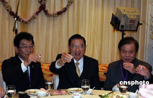11月26日下午,海峽交流基金會董事長江丙坤(中)抵達金門,將出席27日舉辦的“福建地區(qū)臺商投資權(quán)益保障研討會”。他表示,希望兩岸共同打擊犯罪、金融登陸等議題能在六個月內(nèi)取得成果。圖為;鶗黹g宴請出席研討會的福建近百位臺商。中新社發(fā) 周兆軍 攝