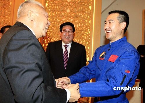 圖為董建華與航天員翟志剛親切交談。