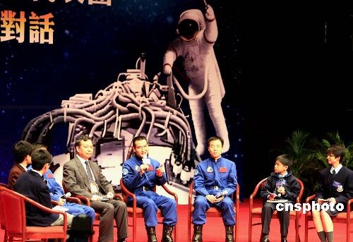 圖為中國(guó)載人航天工程辦公室主任及副團(tuán)長(zhǎng)王文寶及三位航天員與香港學(xué)生真情對(duì)話。