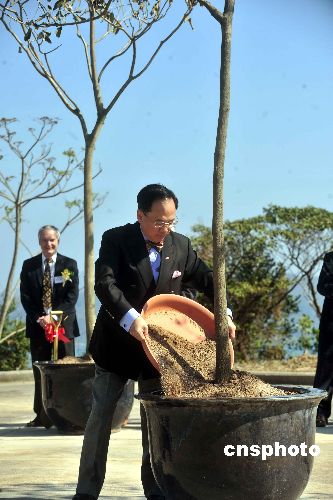 一月五日,香港科技大學(xué)與普林斯頓大學(xué)高等研究院簽訂協(xié)議,合作成立科大高等研究院,香港特首曾蔭權(quán)特到場(chǎng)植樹(shù)紀(jì)念。中新社發(fā) 譚達(dá)明 攝