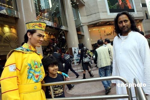 二月十九日,“香港電影百年展”在時代廣場舉行,展覽內(nèi)容包括香港電影業(yè)百年間的發(fā)展歷史、早期的電影海報、明星相及廣告。圖為古裝扮相的演員與游客同樂。中新社發(fā) 洪少葵 攝