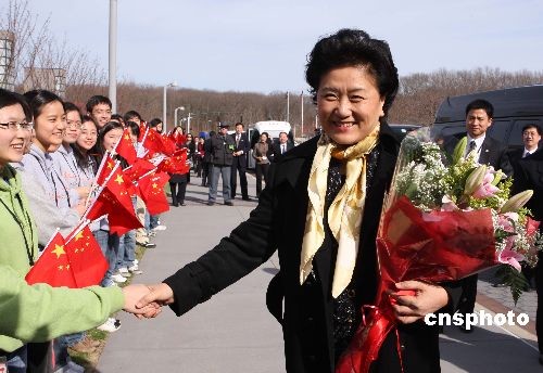 當(dāng)?shù)貢r(shí)間4月13日,率領(lǐng)代表團(tuán)正在美國訪問的國務(wù)委員劉延?xùn)|,來到紐約州立大學(xué)石溪分校參加一系列活動(dòng),并看望了接受獎(jiǎng)學(xué)金正在紐約州立大學(xué)學(xué)習(xí)的150名四川地震災(zāi)區(qū)大學(xué)生代表。圖為劉延?xùn)|到達(dá)石溪分校時(shí),受到學(xué)生們的熱烈歡迎。中新社發(fā) 魏晞 攝