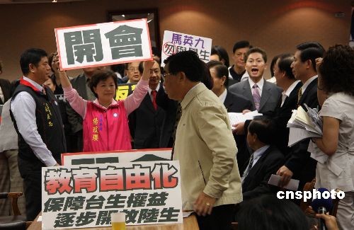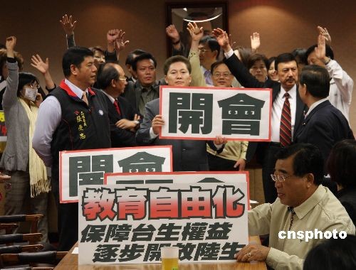 5月4日上午,臺(tái)灣“立法院”內(nèi)政委員會(huì)原定審查事關(guān)大陸學(xué)歷認(rèn)證、開放大陸學(xué)生來臺(tái)的兩岸人民關(guān)系條例部分條文修正草案。民進(jìn)黨團(tuán)總動(dòng)員,杯葛內(nèi)政委員會(huì)議事進(jìn)行,并占據(jù)主席臺(tái)。民進(jìn)黨團(tuán)提散會(huì)動(dòng)議,以八比七的票數(shù)未能通過。民進(jìn)黨“立委”繼續(xù)占據(jù)主席臺(tái),會(huì)議無法進(jìn)行。圖為民進(jìn)黨“立委”占據(jù)主席臺(tái)后,國民黨“立委”舉起要求正常開會(huì)的標(biāo)語牌。中新社發(fā) 耿軍 攝