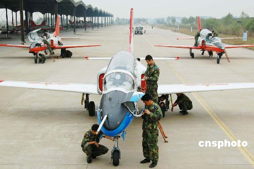 圖為10月22日,濟空某飛行學(xué)院飛行訓(xùn)練現(xiàn)場一組鏡頭。擔(dān)負培養(yǎng)和造就高素質(zhì)新型飛行人才重任的濟空某飛行學(xué)院,在飛行人員中開展“一心一意跟黨走、苦練精飛謀打贏”的主題活動,在機務(wù)和后勤官兵中開展“立足本職作貢獻、再接再厲立新功”為主題的崗位練兵和安全競賽活動,把學(xué)習(xí)十七大精神的政治熱情轉(zhuǎn)化到“牢記使命責(zé)任,苦練打贏本領(lǐng)”的具體行動中。中新社發(fā) 耿國慶 攝