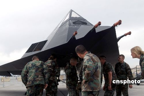 美國為紀(jì)念六十年前成立空軍,十一月在內(nèi)華達州的內(nèi)利斯空軍基地舉辦大規(guī)模飛機展示,美軍人員貼身參觀世界上第一種可正式作戰(zhàn)的隱型戰(zhàn)斗機F-117A“夜鷹”,此極專門用于夜間攻擊。中新社發(fā) 賈國榮 攝