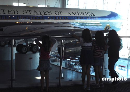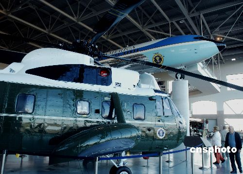 美國(guó)民眾十一月十九日參觀洛杉磯的里根總統(tǒng)博物館,大廳里展示當(dāng)年三任總統(tǒng)乘坐過(guò)的空軍一號(hào)專機(jī)和海軍一號(hào)直升機(jī)。中新社發(fā) 賈國(guó)榮 攝