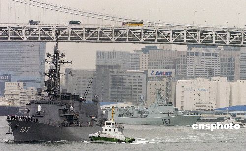11月28日,中國海軍“深圳”號(舷號167)導(dǎo)彈驅(qū)逐艦在日本海上自衛(wèi)隊“雷”號護衛(wèi)艦的引導(dǎo)下如期抵達東京晴海碼頭,開始對日為期四天的友好訪問。這是中國海軍軍艦第一次訪問日本。中新社發(fā) 朱沿華 攝
