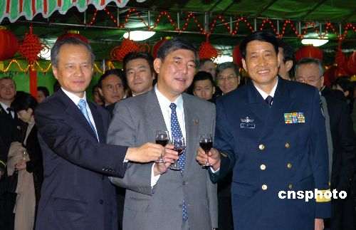 11月30日晚,正在日本進(jìn)行正式友好訪問(wèn)的中國(guó)海軍導(dǎo)彈驅(qū)逐艦“深圳號(hào)”在甲板舉行招待會(huì),日本防務(wù)大臣石破茂、海軍司令吉川榮治,中國(guó)駐日大使崔天凱、公使孔鉉佑、武官徐京明等出席,日本107護(hù)衛(wèi)艦官兵代表及各國(guó)駐日武官三百多人參加。圖為崔天凱大使(左)、石破茂防務(wù)大臣(中)和中國(guó)海軍軍艦訪日?qǐng)F(tuán)指揮員、南海艦隊(duì)副司令肖海洋少將,共同舉杯祝愿中日兩國(guó)世代友好。中新社發(fā) 滕劍峰 攝