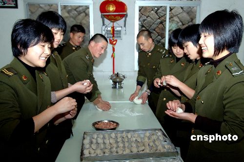 2月5日,駐閩某部女兵在軍營(yíng)營(yíng)房前高掛大紅燈籠,在軍營(yíng)食堂包餃子,喜迎新春佳節(jié)的到來。中新社發(fā) 劉可耕 攝