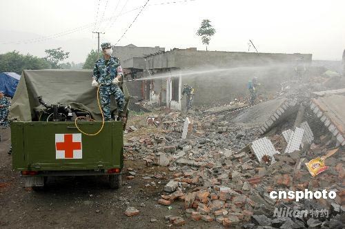 5月下旬,海軍衛(wèi)生防疫消殺突擊分隊(duì)的防疫車對四川地震災(zāi)區(qū)民房進(jìn)行預(yù)防性消毒。截至到5月30日上午,由86名專業(yè)隊(duì)員組成的衛(wèi)生防疫消殺突擊分隊(duì)已完成對四川綿竹、什邡等地震重災(zāi)區(qū)60多個(gè)市區(qū)街道、村莊的廢墟、房舍、疑似疫源地等場所進(jìn)行衛(wèi)生防疫和消毒殺菌,有效地控制了災(zāi)區(qū)的疫情隱患。中新社發(fā) 李唐 攝