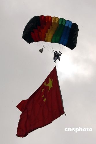 11月初,第七屆中國國際航空航天博覽會上,中國空軍跳傘運動大隊的27名隊員先后進(jìn)行了跳傘表演,其中的喜從天降、航空盛典、東方之珠、金龍飛舞、空中彩虹等精彩課目。圖為空軍跳傘運動大隊隊員肖茜蓉帶著鮮艷的五星紅旗第一個從天而降。中新社發(fā) 譚超 攝