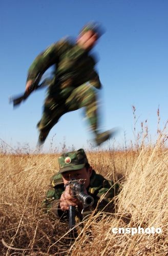 2008年12月25日,濟(jì)南軍區(qū)某部正在組織官兵進(jìn)行戰(zhàn)術(shù)訓(xùn)練。連日來,該部把官兵拉到野外生疏地域,著力開展嚴(yán)寒條件下的冬季野營(yíng)訓(xùn)練,全面鍛煉部隊(duì)在嚴(yán)寒條件下的整體作戰(zhàn)能力。中新社發(fā) 梁志杰 攝