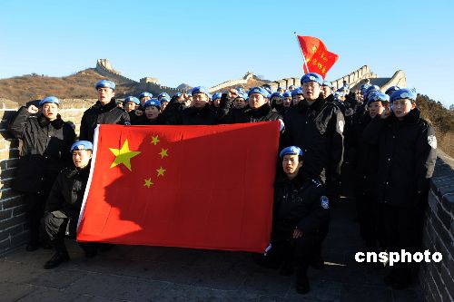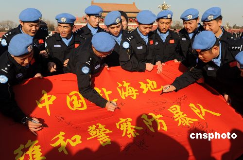 2009年1月1日,中國(guó)第八支赴海地維和警察防暴隊(duì)在北京八達(dá)嶺長(zhǎng)城和天安門(mén)廣場(chǎng)舉行維和宣誓暨簽名活動(dòng),激勵(lì)全體隊(duì)員牢記維和職責(zé),苦練精兵,為維護(hù)世界和平做出積極貢獻(xiàn)。該支維和警察防暴隊(duì)以山東公安邊防總隊(duì)為主組建,目前正在河北廊坊中國(guó)維和警察培訓(xùn)中心接受綜合培訓(xùn),將于今年4月份出征海地執(zhí)行維和任務(wù)。中新社發(fā) 由永懷 攝