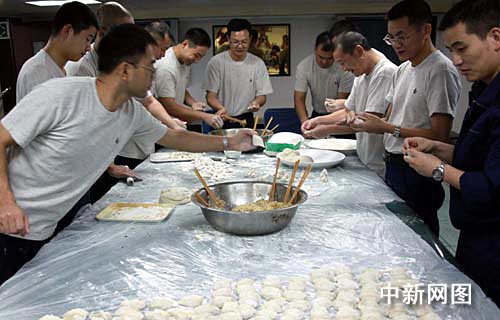 “?凇碧枌(dǎo)彈驅(qū)逐艦官兵包餃子過新年。中新社記者 孫自法 攝