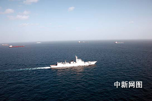 當(dāng)?shù)貢r(shí)間2月18日早晨,中國海軍艦艇編隊(duì)順利完成在亞丁灣、索馬里海域執(zhí)行護(hù)航任務(wù)以來最大規(guī)模的一次護(hù)航行動(dòng),將中外13艘商船送抵亞丁灣東部安全海域。圖為17日在艦載直升機(jī)上航拍“?凇碧枌(dǎo)彈驅(qū)逐艦護(hù)航商船的場景。作者 倪容攝