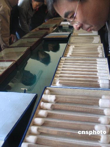 十月十八日,蘭州市民在甘肅簡(jiǎn)牘展覽室欣賞兩千年前的漢簡(jiǎn)。甘肅簡(jiǎn)牘保護(hù)研究中心經(jīng)批準(zhǔn)成立,并于十月十八日揭牌,長(zhǎng)期擠放于陰冷庫(kù)房里的萬(wàn)枚珍貴簡(jiǎn)牘正式宣告“換新房”。甘肅先后出土簡(jiǎn)牘六萬(wàn)余枚,尤以漢簡(jiǎn)數(shù)量最多,現(xiàn)分別收藏于英國(guó)倫敦的大英圖書(shū)館、臺(tái)北南港歷史語(yǔ)言研究所和甘肅。因人員、經(jīng)費(fèi)原因,漢簡(jiǎn)在甘肅保存條件很差,出現(xiàn)了變形損毀等嚴(yán)重情況。簡(jiǎn)牘,是中華民族先民們對(duì)政治、軍事、經(jīng)濟(jì)、社會(huì)、文化等活動(dòng)的記錄。中新社發(fā) 殷春永 攝