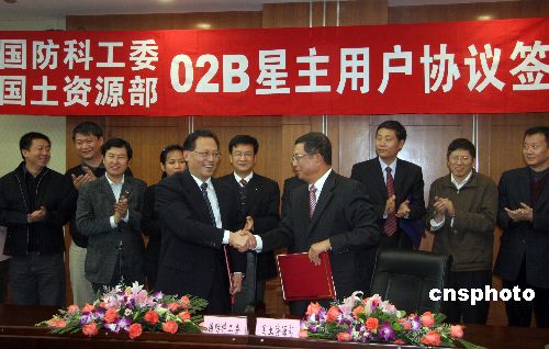 十月二十九日下午,中國國防科學(xué)技術(shù)工業(yè)委員會與國土資源部簽署協(xié)議,后者正式成為中巴地球資源衛(wèi)星○二B星主用戶,雙方將以此為契機,攜手推動并充分發(fā)揮中巴地球資源衛(wèi)星○二B星的應(yīng)用效益。國防科工委副主任兼國家航天局局長孫來燕(左)、國土資源部副部長李元代表雙方簽署《國防科工委、國土資源部關(guān)于中巴地球資源衛(wèi)星○二B星主用戶機制試點的協(xié)議》。中新社發(fā) 孫自法 攝