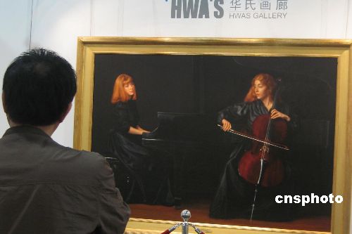 全亞洲最大規(guī)模的藝術(shù)品展示交易平臺——二○○七(第十一屆)上海藝術(shù)博覽會十一月十五日起在上海世貿(mào)商城舉行,眾多海內(nèi)外實(shí)力畫廊或機(jī)構(gòu)均攜其得意之作前來參展。圖為由上海華氏畫廊參展的已故大師陳逸飛油畫代表作《二重奏》,這是陳逸飛音樂題材肖像畫中尺寸最大的一幅,也是他當(dāng)年轟動美國藝術(shù)界的重量級油畫作品。中新社發(fā) 孫璐 攝