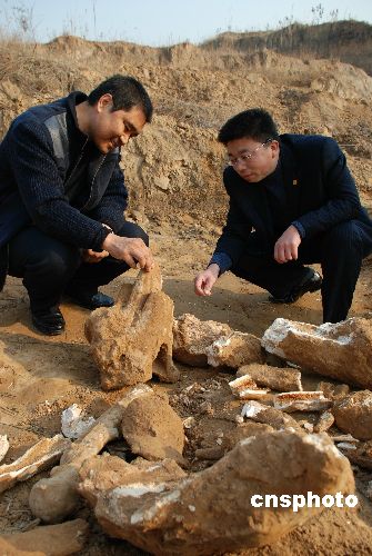 12月5日,山東淄博周村區(qū)王村鎮(zhèn)西道村磚廠挖掘出疑似“恐龍”的巨型動(dòng)物骨骼化石。當(dāng)日10點(diǎn)48分,正在淄博周村區(qū)王村鎮(zhèn)西道村磚廠施工的司機(jī)小郝,給村主任劉道新打電話說(shuō)“挖掘機(jī)在工作時(shí)挖到了大量的化石,很像是動(dòng)物的骨骼!痹诂F(xiàn)場(chǎng)進(jìn)行保護(hù)的彭陽(yáng)派出所的所長(zhǎng)于成杰介紹說(shuō),這次挖到的化石很大,露出來(lái)的化石有6米多長(zhǎng),呈圓柱狀細(xì)端的直徑有18-19厘米,粗端的直徑有30-40厘米。其動(dòng)物骨格的特征非常明顯,其體積顯然比大象要大的多,與史前動(dòng)物“恐龍”骨骼化石極其相似。中新社發(fā) 梁寶海 攝