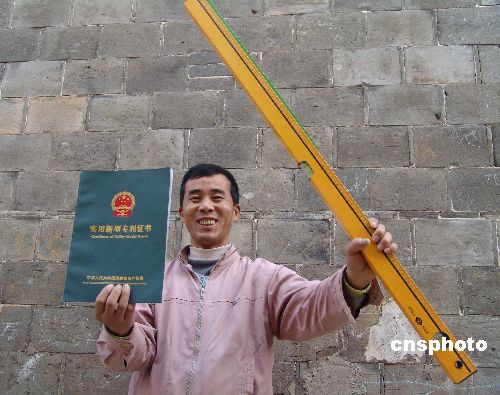 12月8日,程成高在展示他發(fā)明的“帶抹砂漿機(jī)構(gòu)的水平尺”。江西省樂平市后港鎮(zhèn)程家村農(nóng)民程成高,只有小學(xué)三年級(jí)文化,但他憑借自己的勤奮和智慧,克服困難,用4年的時(shí)間,發(fā)明了集抹砂漿與測量水平與一身的“帶抹砂漿機(jī)構(gòu)的水平尺”,并獲得了國家實(shí)用新型專利證書,成為當(dāng)?shù)剞r(nóng)民的典范。另外,他的又一項(xiàng)發(fā)明“滾輪式清掃畚箕”正在申請(qǐng)專利中。中新社發(fā) 石衛(wèi)明 攝