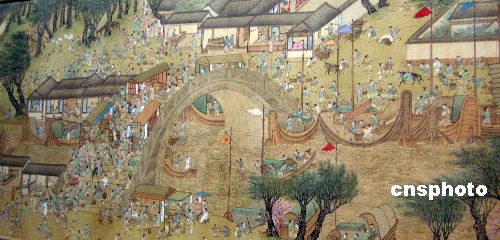 2月1日,“世貌風(fēng)情——中國(guó)古代人物畫(huà)精品展”在上海博物館開(kāi)展。明代著名畫(huà)家仇英傳世名作《清明上河圖卷》仿本在展覽會(huì)上露面。該畫(huà)結(jié)構(gòu)大體按北宋張擇端《清明上河圖》的景物順序布局,描繪的是明朝中期蘇州繁榮的景象。圖為該畫(huà)局部。中新社發(fā) 姜煜 攝