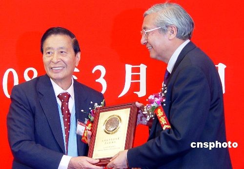 圖為北京大學(xué)校長(zhǎng)許智宏向李家誠(chéng)(右)頒發(fā)名譽(yù)校董紀(jì)念牌。