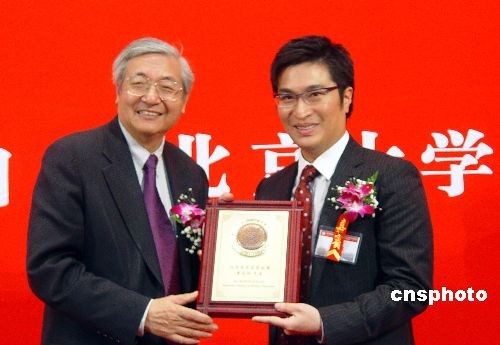 圖為北京大學(xué)校長(zhǎng)許智宏向李兆基(左)頒發(fā)名譽(yù)校董紀(jì)念牌。