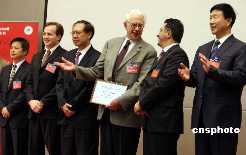 四月九日,全球500強、世界領(lǐng)先的多元化高科技制造企業(yè)霍尼韋爾公司攜手北京航空航天大學(xué),共同拉開2008年霍尼韋爾—諾貝爾全球校園行的序幕。諾貝爾物理獎獲得者謝爾登·格拉肖博士(右三)親臨現(xiàn)場為學(xué)子們講授了他的學(xué)術(shù)成果和科研心得,與學(xué)生們進行了面對面的交流。霍尼韋爾—諾貝爾全球校園行活動由霍尼韋爾公司發(fā)起,旨在全球范圍內(nèi)提升高校科學(xué)教育、培養(yǎng)高素質(zhì)科技創(chuàng)新人才的社會公益活動。中新社發(fā) 任海霞 攝