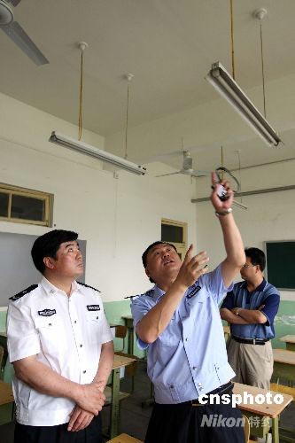 六月六日,2008年中國(guó)高考的最后準(zhǔn)備階段。從當(dāng)日下午起,北京各個(gè)高考點(diǎn)將進(jìn)行教室安全檢查、貼封條的最后階段,北京警方也投入力量對(duì)教室進(jìn)行最后的安全檢查,排除隱患,確保高考順利進(jìn)行。中新社發(fā) 任海霞 攝