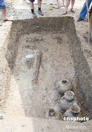 2008年7月24日,蘇州博物館考古工作者對蘇州相城區(qū)古宮黃泥村的一座西漢古墓進行發(fā)掘,該古墓出土了一批墓葬品,共有3組6件,包括青銅鏡、陶壺、陶瓿和陶罐以及釉陶,都是兩個一對的組合,不僅器形較大,釉色更好,而且保存完好。據(jù)了解,該墓葬長3.15米,寬1.60米,被確定為西漢時期,墓葬規(guī)模以及隨葬品都超過以往發(fā)現(xiàn)的同年代墓葬,具有一定的價值。中新社發(fā) 朱子寒 攝