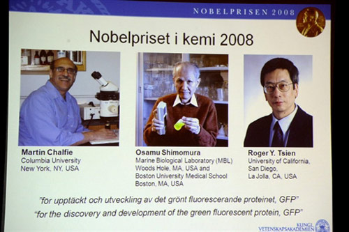 當?shù)貢r間10月8日11時45分左右(北京時間10月8日17時45分左右),瑞典皇家科學院諾貝爾獎委員會于宣布,將2008年度諾貝爾化學獎授予美國日裔科學家下村修(Osamu Shimomura)、美國科學家馬丁·查爾菲(Martin Chalfie),以及美國華裔科學家錢永健。他們?nèi)嗽诎l(fā)現(xiàn)和研究綠色熒光蛋白(GFP)方面有突出成就。