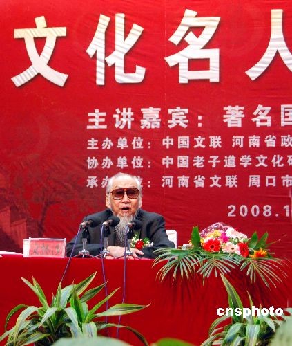 10月21日,著名國(guó)學(xué)大師文懷沙在名人講壇上縱論老子,博得全場(chǎng)陣陣掌聲。10月20日晚,“2008中國(guó)鹿邑國(guó)際老子文化節(jié)”在老子故里河南省鹿邑縣召開,98歲高齡的著名國(guó)學(xué)大師文懷沙出席了開幕式。據(jù)悉,本屆文化節(jié)由中國(guó)文聯(lián)、政協(xié)河南省委員會(huì)、中國(guó)國(guó)際文化傳播中心主辦,為期兩天,以“建設(shè)民族精神家園——尊道·貴德·和諧·發(fā)展”為主題,包括老子文化高層論壇、國(guó)學(xué)大師文懷沙報(bào)告會(huì)、經(jīng)貿(mào)合作與簽約儀式等活動(dòng)。 鹿邑縣位于河南省東部,是道家學(xué)派創(chuàng)始人老子的故里,被稱為“道家之源,道教祖庭,李姓之根”。中新社發(fā) 蔣保慶 攝
