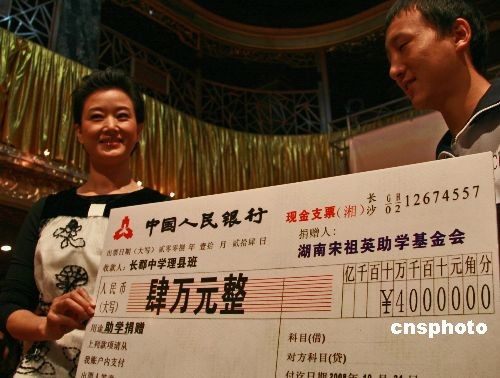 10月24日,湖南宋祖英助學基金會攜手人民銀行、湖南省婦聯(lián)、湖南省教育廳以及今日女報社,捐資65萬元,資助500名困難學生和10名教師,其中包括58名長郡中學理縣班學生和湖南大學、中南大學的20名來自四川災區(qū)的大學生。湖南宋祖英助學基金會2006年5月登記成立,到目前為止,共捐資120余萬元,資助貧困學生、獎勵優(yōu)秀教師1000多人。中新社發(fā) 張家根 攝