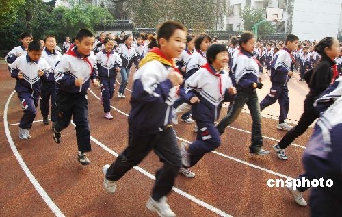 2008年10月27日,蘇州市東中市實(shí)驗(yàn)小學(xué)的1400的多名學(xué)生舉行了陽光體育冬季長跑活動(dòng)。通過開展冬季長跑活動(dòng),可以磨練青少年學(xué)生的意志品質(zhì),培養(yǎng)良好的鍛煉習(xí)慣,有效提高學(xué)生體質(zhì)特別是耐力素質(zhì)水平,進(jìn)一步掀起陽光體育運(yùn)動(dòng)的新高潮,這也是根據(jù)國家有關(guān)部門的要求而進(jìn)行的。中新社發(fā) 朱子寒 攝