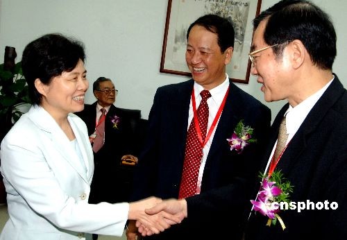 圖為出席該學(xué)院建校五十周年慶祝大會(huì)的中共福建省委常委、福建省副省長(zhǎng)兼中共福建省委教育工委書(shū)記陳樺(左一)親切問(wèn)候臺(tái)灣中國(guó)醫(yī)藥大學(xué)校長(zhǎng)黃榮村。